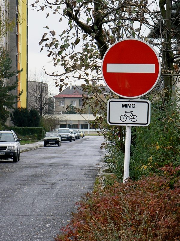 Stejně jako v ul. Na aleji i na ul. Slezská je nyní cyklistům oficiálně umožněn průjezd jednosměrkou kolem garáží i v protisměru.