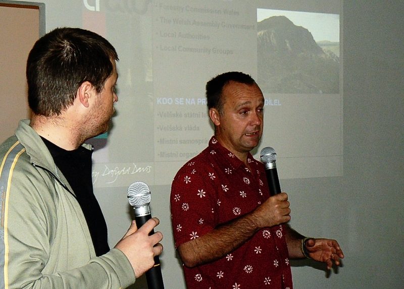 T. Kvasnička (ČeMBA) a D. Davis (vpravo) při prezentaci singletracků ve Walesu