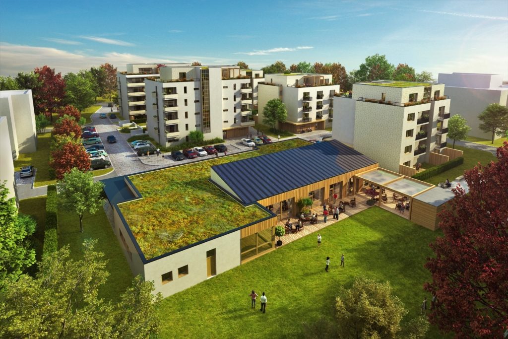 Domy jsou částečně v industriálním stylu s šikmou střechou pro solární střešní tašky.