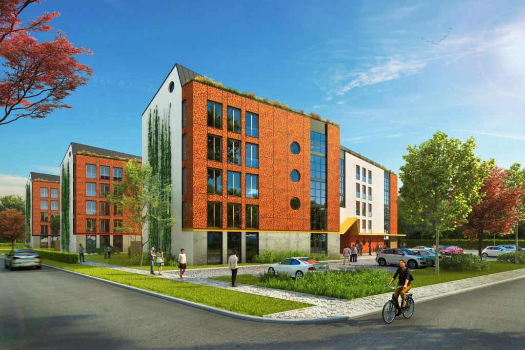 Část fasád a balkonů je navržena z perforovaných kompaktních desek v rezavé barvě. Domy mají také vybočené fasády s velkými okny. Koncipovány v nich jsou prostorné chodby (orientované směrem k nádraží), vhodné pro setkávání, a také schodiště a výtah. Kryty jsou rovnou střechou osázenou zelení, která bude i na stříškách nad vstupními prostory do domů.