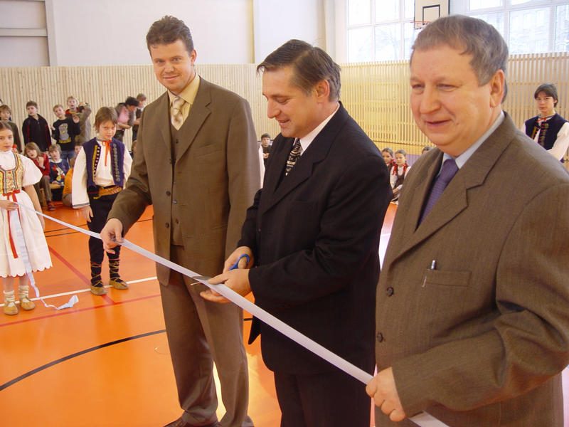 „Stavba byla zahájena v polovině minulého roku a loni jsme stihli i její kolaudaci. Hrací plocha je variabilní a máme tu tribunu pro 250 diváků, pod kterou vzniklo i potřebné sociální zázemí se šatnami a toaletami,“ sdělil místostarosta Frýdku-Místku Miroslav Dokoupil, který dětem slíbil, že si přijde do tělocvičny někdy zasportovat. Tohoto výjimečného příslibu se ihned chytil místostarosta Petr Cvik, který se nechal slyšet, že si tuto příležitost určitě nenechá ujít a že Miroslav Dokoupil bude kapitánem družstva. „Každé sportoviště, které ve městě vznikne, má obrovský význam. Hodiny tělesné výchovy v této tělocvičně budou určitě o něčem jiném než ve staré, která je v nevyhovujícím stavu. Výstavbou nové tělocvičny zároveň vznikl krytý průchod, kterým se děti dostanou do jídelny. Jsme rádi, že máme ve městě další místo, kde se může hrát i vrcholový sport.,“ prohlásil místostarosta Frýdku-Místku Petr Cvik, který poděkoval poslanci Petrovi Rafajovi za to, že pomohl městu získat dvanáctimilionovou dotaci. „Tělocvična je velmi pěkně provedená, takže ta námaha určitě stála za to,“ reagoval Petr Rafaj.