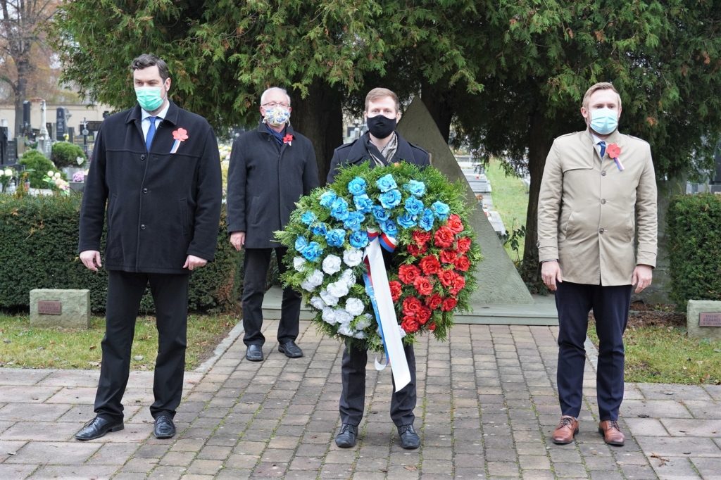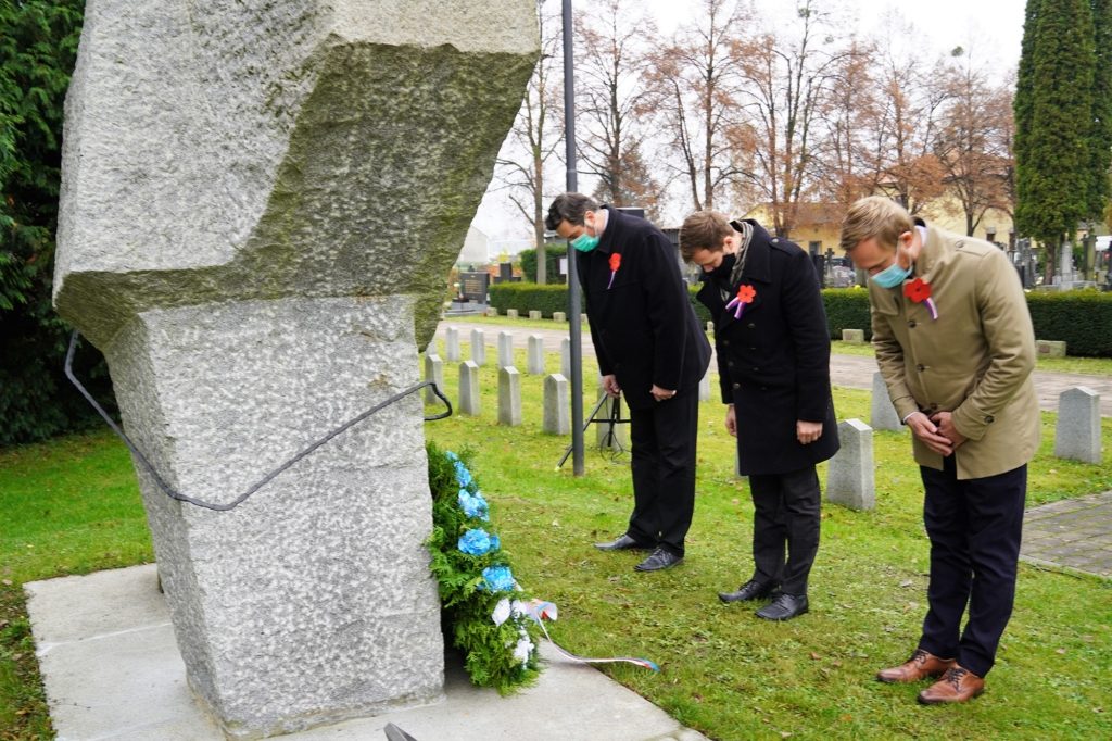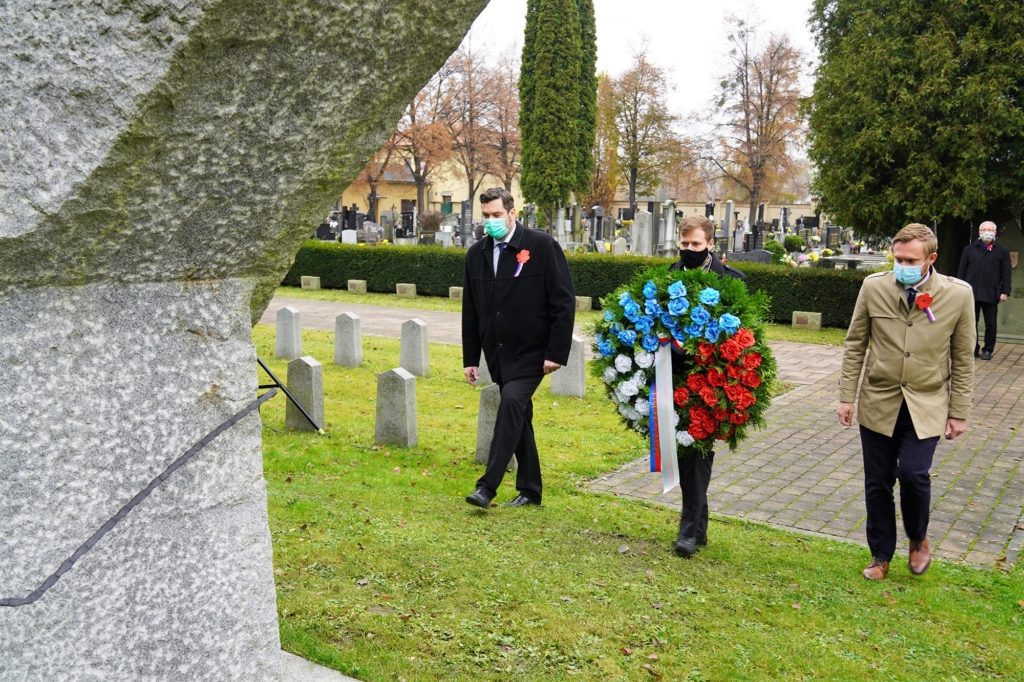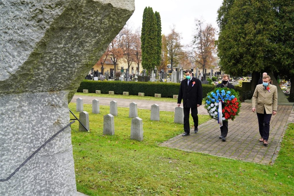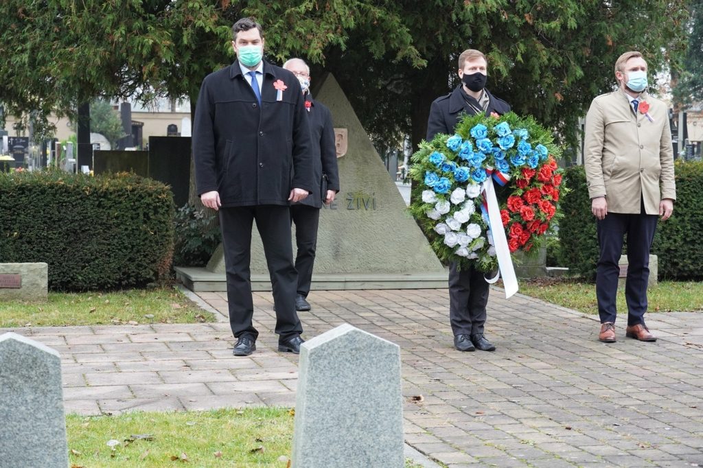 V jedenáct hodin zde zazněly bez účasti širší veřejnosti státní hymny a zástupci vedení města položili pietní kytice. „Dneska je to výjimečné, bez veřejnosti, bez proslovů, s rouškami, ale naše přítomnost dokazuje, že chceme válečné hrdinství těch, kteří bojovali a bojují za naši svobodu, připomínat za všech okolností,“ řekl primátor Michal Pobucký.