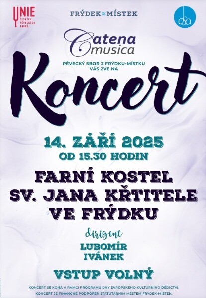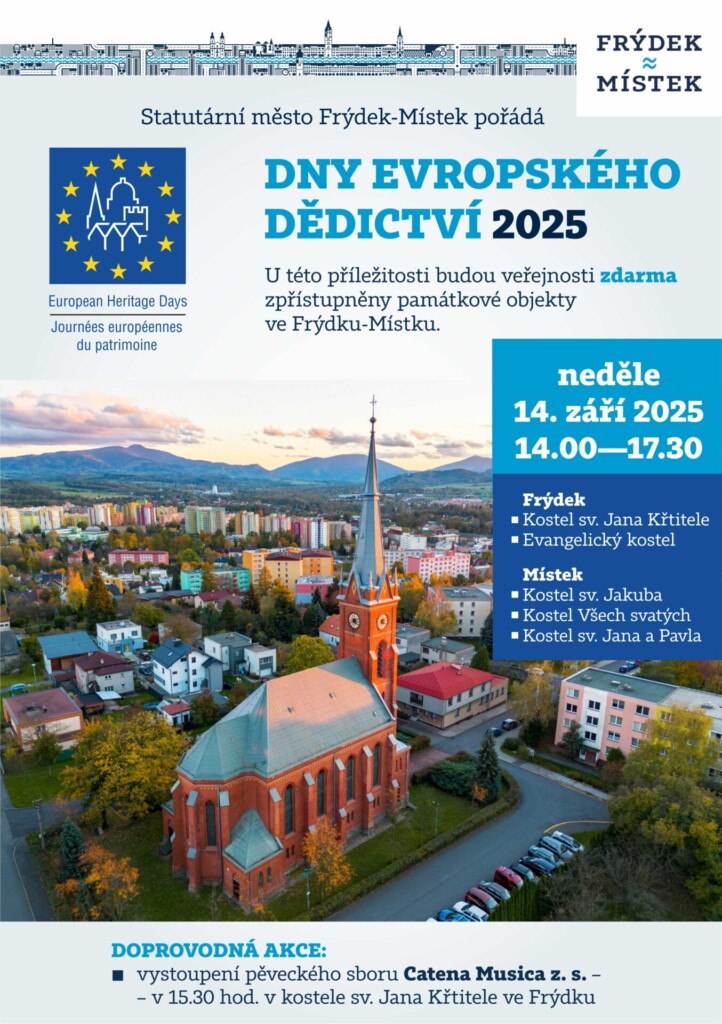 V rámci Dnů evropského dědictví se koná 14. září 2025 od 15.30 hodin v kostele sv. Jana Křtitele ve Frýdku vystoupení pěveckého sboru Catena Musica z. s.