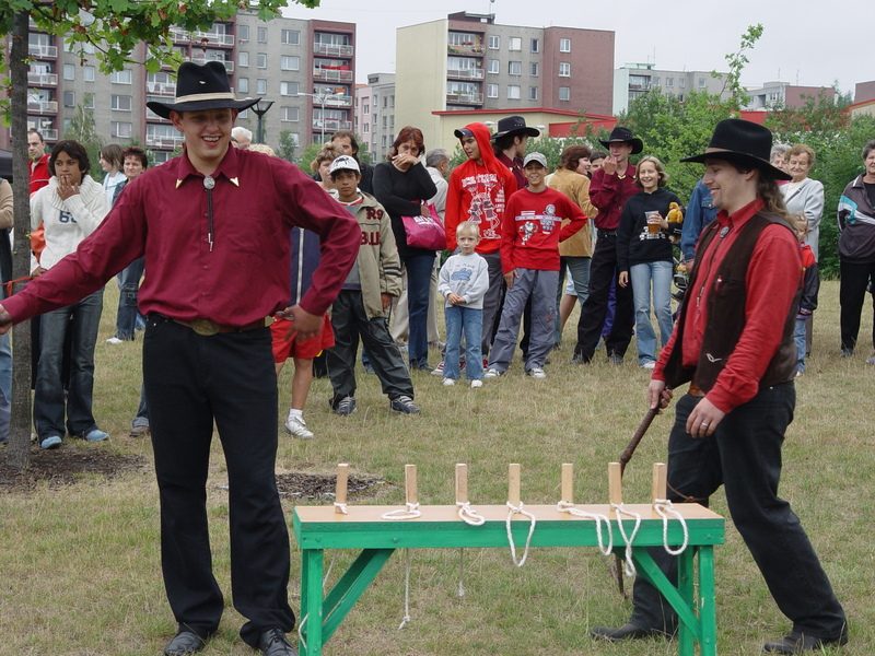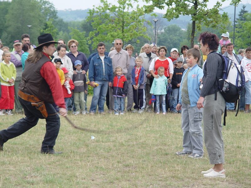 Přivítal je zde předseda Regionu Beskydy poslanec Petr Rafaj, který odpoledne s příchutí westernu zahájil. Tu pravou náladu navodili hned na úvod tanečníci country skupiny Virginia a kromě nezaměnitelné muziky se všichni mohli bavit na jednotlivých stanovištích či ve wigwamech. Velkou pozornost si vysloužil kovboj, který mistrovsky ovládal bič. Nejenže práskáním nadchnul pár jedinců, aby si vyzkoušeli, zda podobný zvuk vyloudí také nebo si nafackují, dokázal rovněž sestřelovat předměty, které nakonec drželi i přítomní diváci. Přepůlení novin nebo sestřelení růže provázely sice občas útrpně zavřené oči „obětí“, ale lidé se dobře bavili a zřejmě bez výjimky všichni věřili, že při mistrovství kovboje nikdo nemůže přijít k úrazu. Děti si vyzkoušely hod lasem, střelbu z luku, podívaly se na indiánské propriety a s velkým gustem se nechaly pomalovat jako indiáni.
