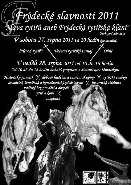 Frýdecké slavnosti budou zahájeny v sobotu 27. srpna po setmění v parku Pod Zámkem. Návštěvníci se mohou těšit na průvod rytířů s pochodněmi, večerní rytířský turnaj i ohňové kejklování. Program bude pokračovat v neděli od 10 do 18 hodin, kdy bude areál parku Pod Zámkem zasvěcen historickému jarmarku, ale také rytířským soubojům, představení jezdeckého a bojového výcviku rytíře s koněm a ukázkám sokolníků s dravci. Středověkou atmosféru navodí také dobová hudba, tanečníci, kejklíři a divadelníci. Návštěvníky bude navíc čekat v rytířském táboře spousta her a soutěží, například v historické střelnici. Velkoplošné stylové stany nabídnou občerstvení s posezením. Vstup je zdarma.