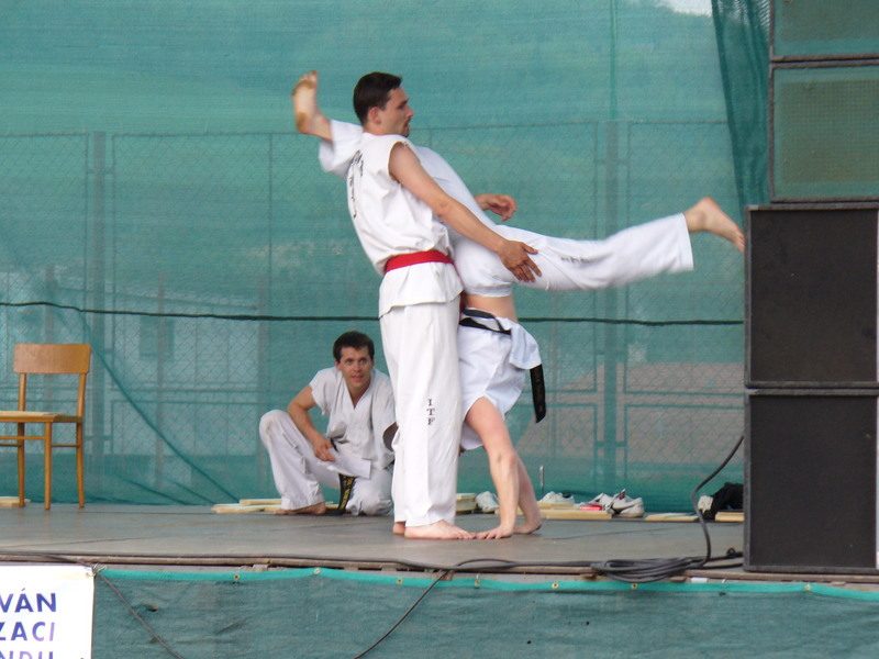 Následovalo přerážení desek. Mirek dvojkop na jeden výskok přímý apcha a boční yopcha a ve výskoku v otočce o 360 stupňů obloukové dollyo. Kamil yop jirumyo chagi (v jednom výskoku boční kop a úder) a ve výskoku otočka nataženou nohou bandae. Přerážel také Radim Tomášek a Peter Lazorik, jejich kombinace si přesně nepamatuji. V programu byly také sebeobrany proti úchopům a úderům, nejprve pomalu a pak každá hned rychle. Peter Lazorik a Mirek Sýkora předvedli ve druhé části exhibice také sebeobrany proti noži, tentokrát všechny rychle, byly plné úderových technik loktem, páčení, hodů a podrazů včetně odzbrojení útočníka. Kamil a Mirek pak také zacvičili dva modelové souboje a asi čtyři sebeobrany, tentokrát proti kopu s úderem naráz nebo proti dvěma kopům, nechyběly podmety, prošlapování kolene, hody. Opět jsme byli připraveni přerážet desky, Radim Tomášek naprosto s přehledem zlikvidoval čtyři desky v jednom výskoku (dokáže i pět bez velké přípravy) a nutno dodat, že měl k tomu opravdu malý rozběh – předvedl dvojité apcha pravou a levou nohou s následným přímým vzhůru nopi chagi a konečným úderem rukou. Při některých exhibicích dokáže přidat po nopi chagi ještě padající kladivo – naeryo chagi – tedy 5 technik na jeden výskok! Kamil Vyvial bezproblémově zvládá náročnou techniku dvojitého rozštěpového kladivového kopu na dvě desky a pouze s pár malými kroky do nápřahu. Likvidace dvou protivníků je v jeho případě možná, určitě má silné nohy. Ondřej Ondruško se umí odrážet od soupeře a překopnout desku, přidal i v otočce ve výskoku bandae dollyo goro chagi o 360 stupňů na desku ve výšce asi 222 cm! Radim Tomášek také předvedl odraz od soupeře s přeražením desky. Srdce diváků si získala scénka Matrix, kterou mnohdy vylepšuje Radim Tomášek a Ondřej Ondruško tak aby nebyla vždy stejná – velký obdiv. Jejich cvičení je spojené s hudbou a ta je důležitým doprovodem, neboť cviky jsou mnohdy do rytmu přizpůsobeny. jak jsem si všiml, diváci se opravdu dobře zasmáli gegům, které si kluci vymysleli.