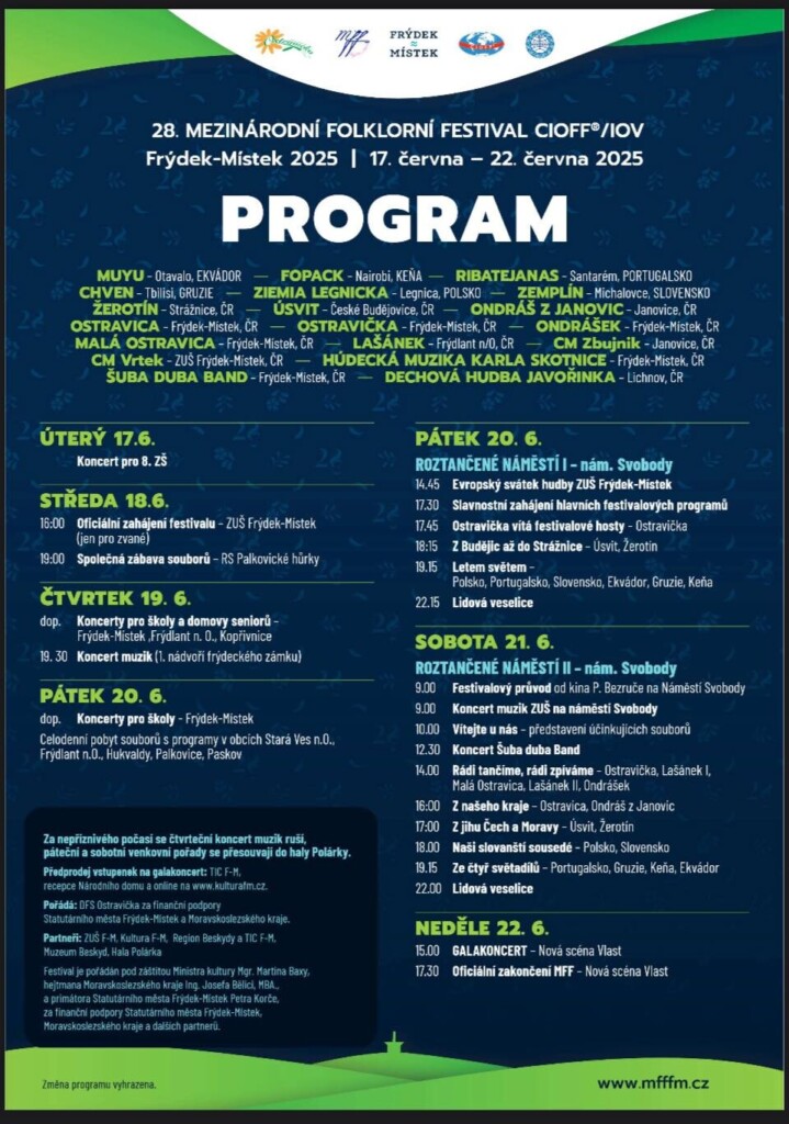 Do Frýdku-Místku dorazí nejen soubory z různých regionů České republiky a Evropy, ale také z dalších světadílů. Dorazí například celky z Ekvádoru, Keni, ale i z Gruzie, Portugalska, sousedního Polska a Slovenska. Chybět samozřejmě nebudou ani domácí zástupci. Ulice města zkrátka ožijí pestrým folklorem z nejrůznějších koutů světa.