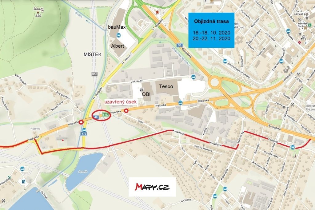 Objízdnou trasu stanovil krajský úřad v obou termínech po ulicích Beskydská – Pod Puklí – Palkovická – Kvapilova.
