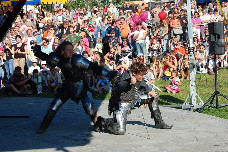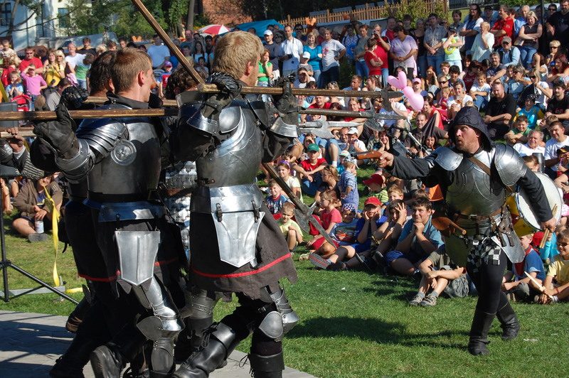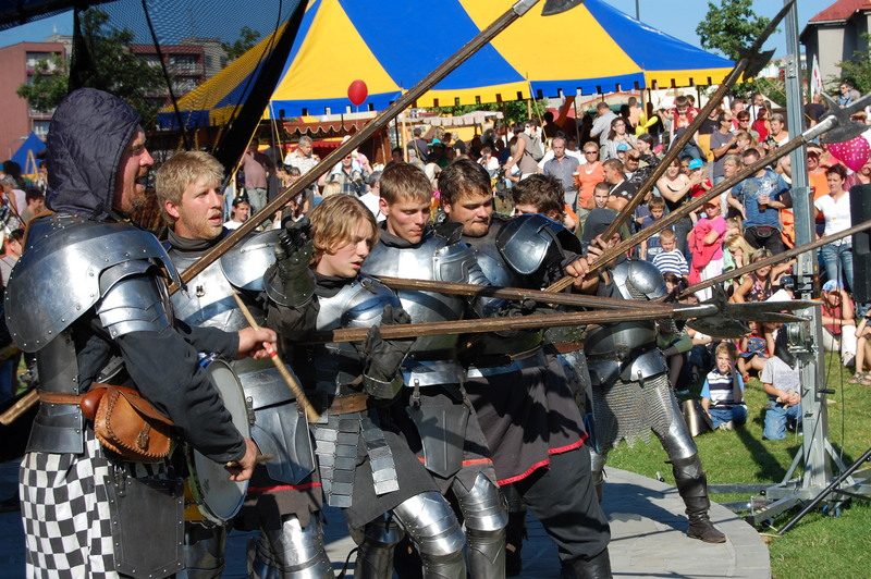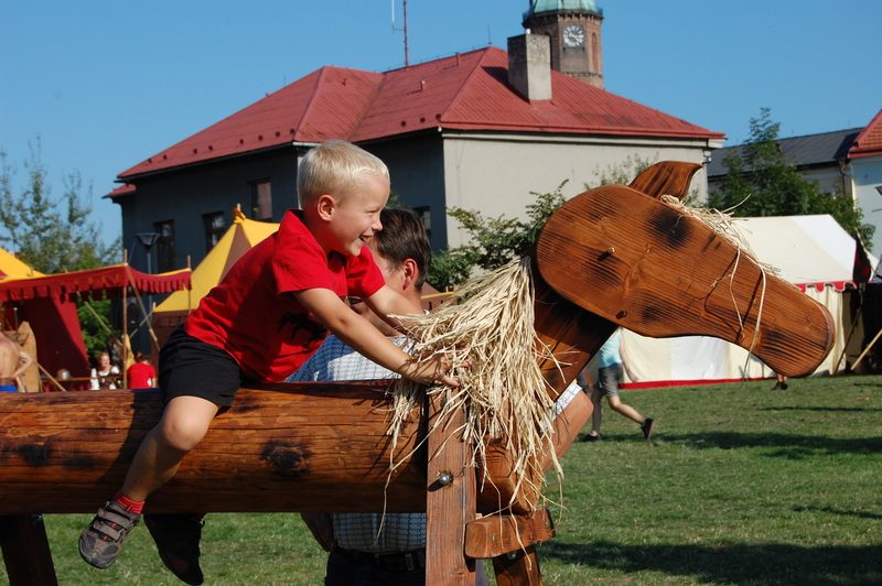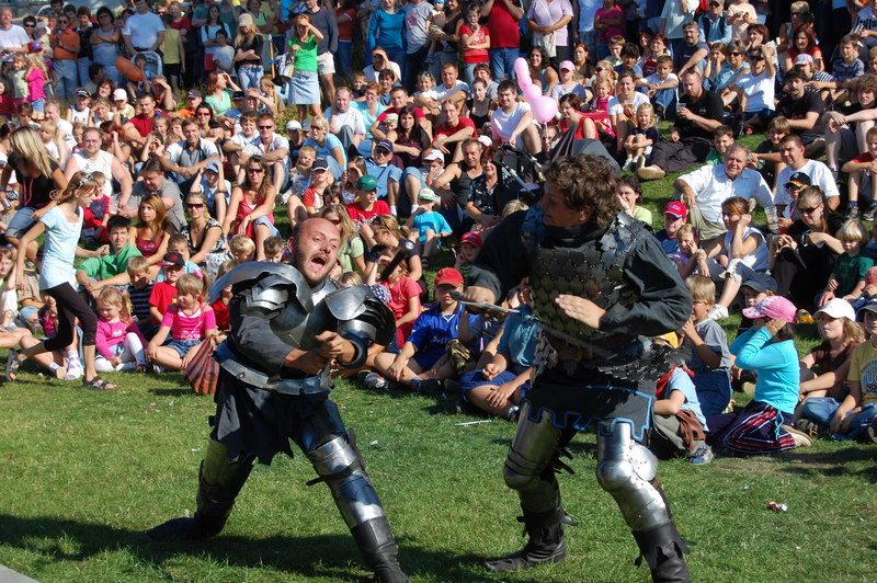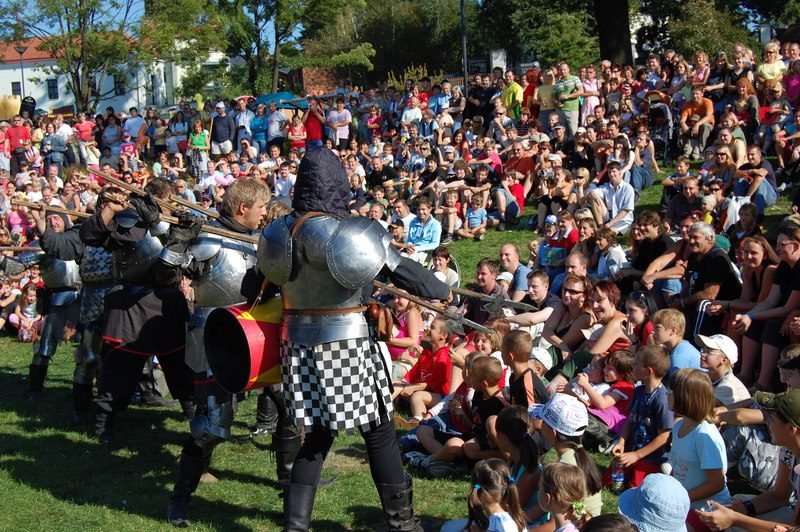 Děti kromě kata hltaly i jednotlivá šermířská představení, v nichž bylo i trochu pyrotechniky, takže boje vypadaly velmi autenticky. Však také při jednom ze soubojů došlo na zlomení zbraně a zranění. Tak jako se ale ve středověku na nějakou tu oběť nehledělo, tak stejně kolegové šermíři pokračovali v klání, zatímco jejich parťák byl ošetřován v zákulisí. V tom kontextu vypadaly některé hrátky s halapartnou směrem k publiku docela nebezpečně, ale o to větší zážitek měly nejen první řady nadšených diváků. Spousta mrňat, která si už ve svém boji s rodiči vydobyla dřevěnou maketu meče, by se v tu ránu do soubojů zapojila.