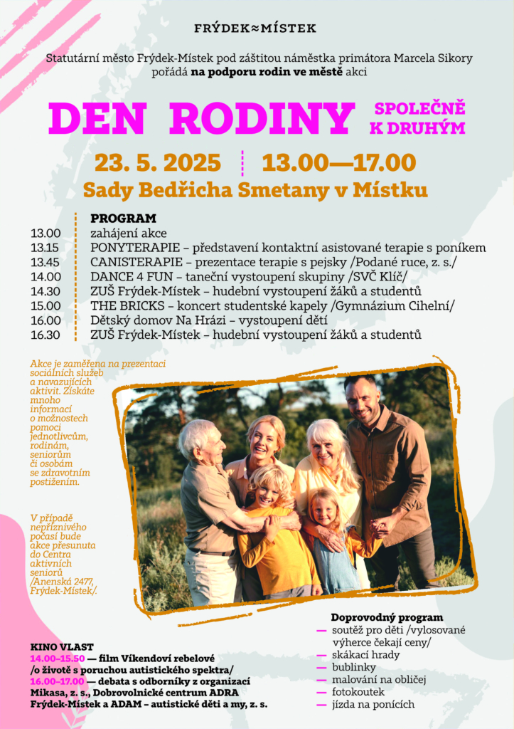 Den rodiny s podtitulem Společně k druhým nebude jen o prezentaci důležitých informací, má za cíl i pobavit. Proto odbor sociálních služeb zajistil také řadu zábavných aktivit. Po oficiálním zahájení ve 13 hodin začne program prezentací kontaktní asistované terapie s poníkem, tzv. ponyterapie. Následně naváže ukázka canisterapie v režii spolku Podané ruce. Vystoupení si připravili tanečníci ze skupiny Dance 4 Fun Střediska volného času Klíč i žáci frýdecko-místecké Základní umělecké školy. Vystoupí také kapela Gymnázia Cihelní The Bricks a děti z Dětského domova Na Hrázi.