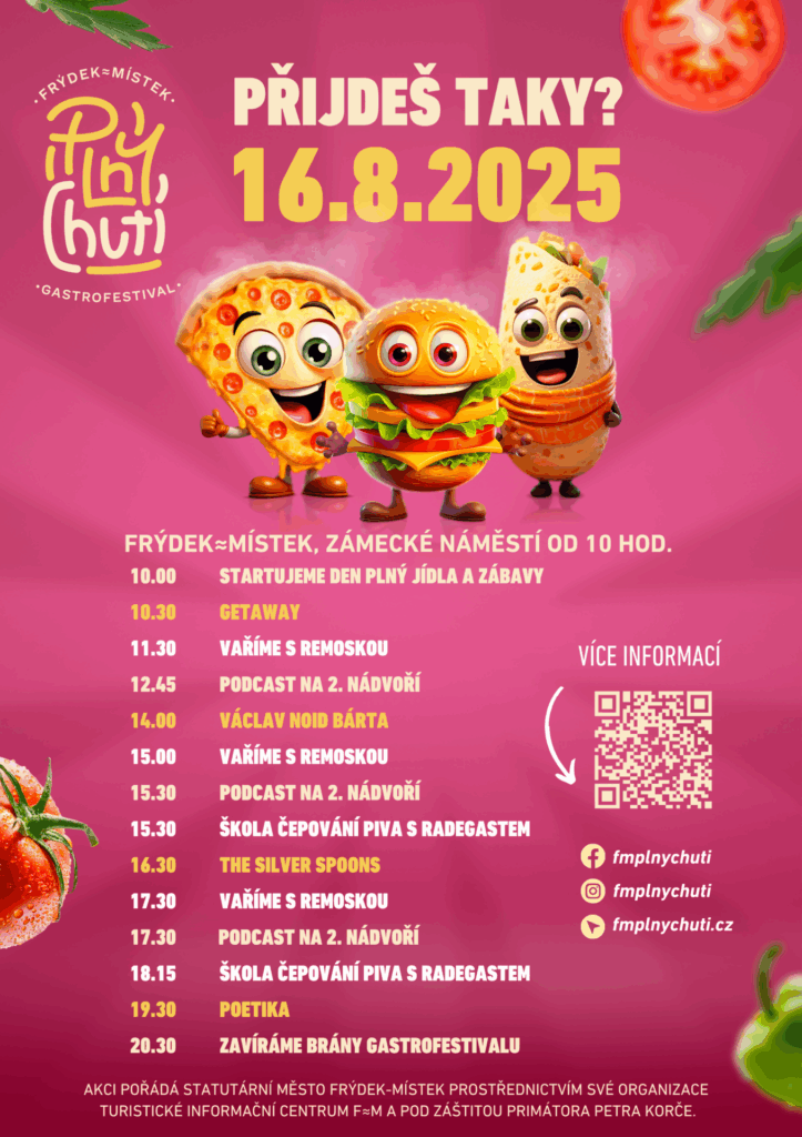 Nechte se unést chutěmi, vůněmi a zážitky, které jinde nenajdete! Podrobný program najdete na webu www.fmplnychuti.cz, aktuální informace sledujte na facebookových stránkách zde: Gastrofestival Frýdek≈Místek plný chutí