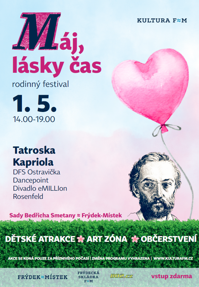 Park Sady Bedřicha Smetany ožije na 1. máje rodinným festivalem. Druhý ročník akce „Máj, lásky čas“ se uskuteční od 14 do 19 hodin a je určen pro všechny generace. Festival nabídne hudební program, umění, dobré jídlo i atrakce pro děti. Pořádá jej radnice prostřednictvím své příspěvkové organizace Kultura F-M a vstupné se neplatí.