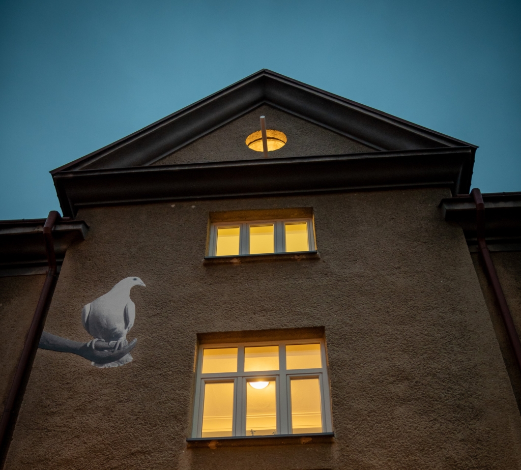 „Námětem je analogie domova s ptačí budkou, kde jedinec prožije dětství a které na prahu dospělosti opouští, jak tomu bylo v případě pobytu Františka Vláčila v tomto domě. Ke ztvárnění motivu je použito půdní kruhové okno, které, opatřeno bílou tyčí (bidýlkem) a společně s trojúhelníkovým štítem evokuje ptačí budku. Níže je použit záběr z Vláčilova průlomového filmu Holubice – holubice sedící na ruce sochy chlapce těsně před odletem. Ke ztvárnění holubice je použita tradiční metoda fresky – malby do mokré omítky. Velikost černobílého filmového obrazu je poměrově určena kruhovým oknem a společně s bílým bidýlkem vytvářejí prostorovou kompozici horní poloviny fasády,“ vysvětlil svůj záměr Oldřich Morys.