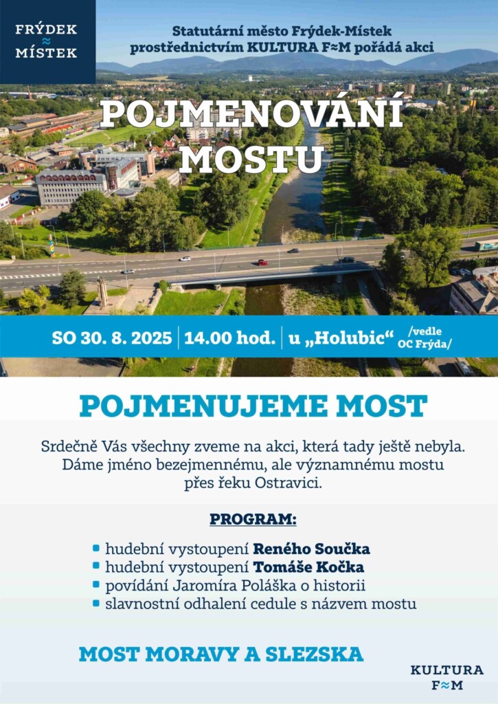 Slavnostní pojmenování mostu se uskuteční v sobotu 30. srpna ve 14 hodin. Vystoupí dva interpreti za moravskou a za slezskou stranu – Tomáš Kočko a René Souček.