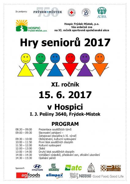 Organizace se v pořádání her střídají. Letos soutěžní i zábavný program zajistil a připravil Hospic F-M. „Každé ze zmíněných sedmi organizací zastupují tři členové, takže soutěžit bude celkem jednadvacet seniorů. Absolvovat budou celkem šest disciplín, které prověří nejen jejich motoriku, ale také bystrost. Připraven je například hod na přesnost, poznávání koření podle čichu, ale také hledání něčeho v něčem,“ přiblížil disciplíny ředitel hospice Jan Jursa s tím, že připravena jsou i taneční vystoupení skupiny ACTIV. Po vyhlášení výsledků je na programu opékání párků na zahradě hospice, která nabízí otevřené ohniště v těsné blízkosti zastřešeného altánu s posezením.