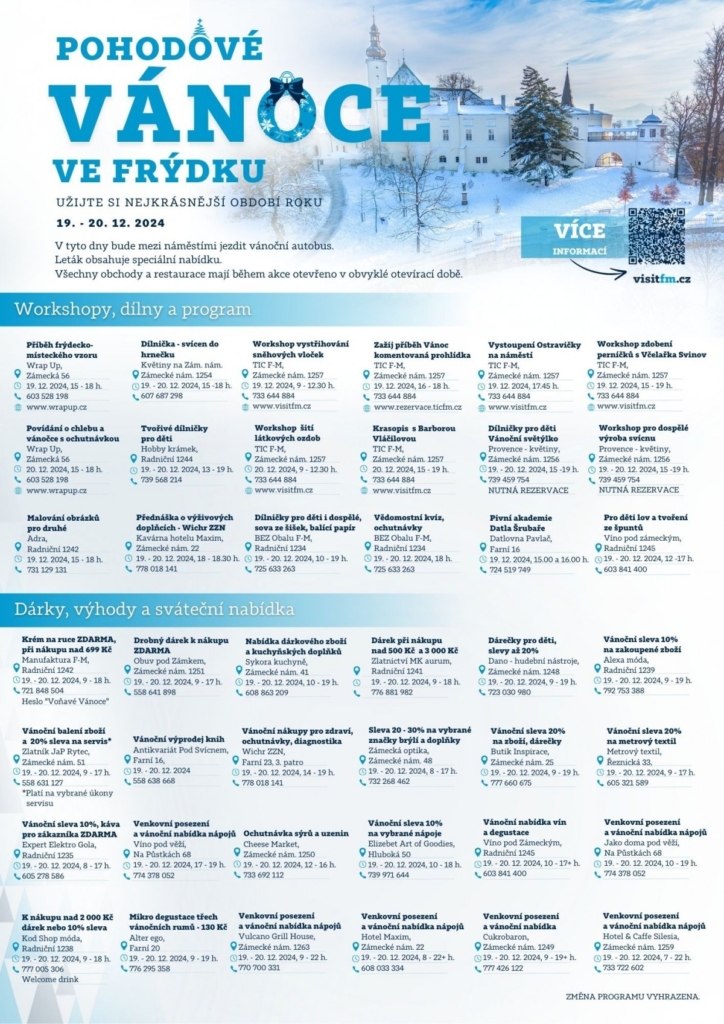 Zámecké náměstí ožije vánoční atmosférou. Připraveny jsou reprodukované koledy, ohrádka se zvířátky a vystoupení souboru Ostravička (19. 12. 17:45). Do akce Pohodové Vánoce ve Frýdku se zapojily restaurace a další provozovny, které nabídnou vánoční předzahrádky, zábavný program nebo slevové akce.