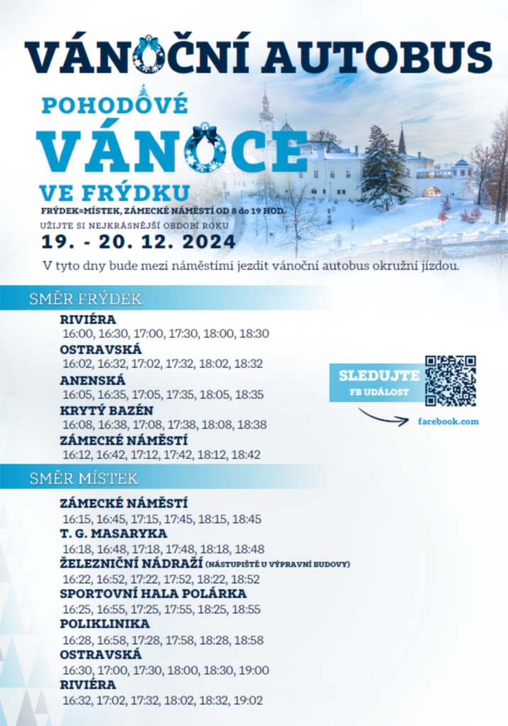 Návštěvníci budou moci využít svoz vánočním autobusem, který bude vyjíždět na Zámecké náměstí co půl hodiny mezi 16. a 19. hodinou. Zastavovat bude na zastávkách Riviéra, točna – Ostravská – Poliklinika – Sportovní hala Polárka – Železniční stanice – Tř. TGM – Zámecké náměstí.