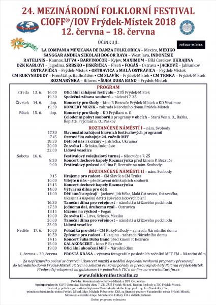 Návštěvníky čeká rozmanitá lidová hudba, tanec a pestré kroje z různých koutů světa. Představí se soubory z Indonésie, Mexika, Litvy, Ukrajiny a Srbska, ale také muzikanti a tanečníci z regionu. V programu festivalu má své tradiční místo koncert muzik, festivalový průvod i večerní lidové veselice, které se konají na místeckém náměstí Svobody. Připraveny jsou i taneční dílny pro veřejnost u křížového podchodu a výtvarné dílny pro děti.