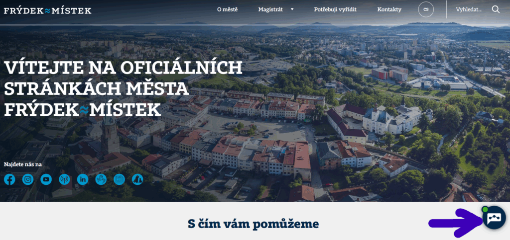 👉 Otevřete webové stránky města Frýdku-Místku a v pravém dolním rohu obrazovky klikněte na ikonu asistenta Chettyho:
