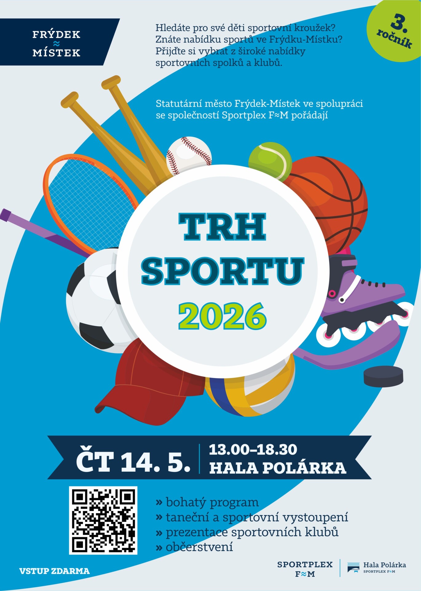 Trh sportu se uskuteční ve čtvrtek 14. 5. 2026 od 13 do 18.30 hodin a koná se zdarma. Vystoupení klubů bude uvádět moderátor. Malí návštěvníci při vstupu obdrží orientační plánek a drobnou pozornost.
