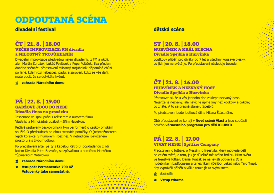 Místa konání: Nová scéna Vlast, zahrada Národního domu, Sokolík