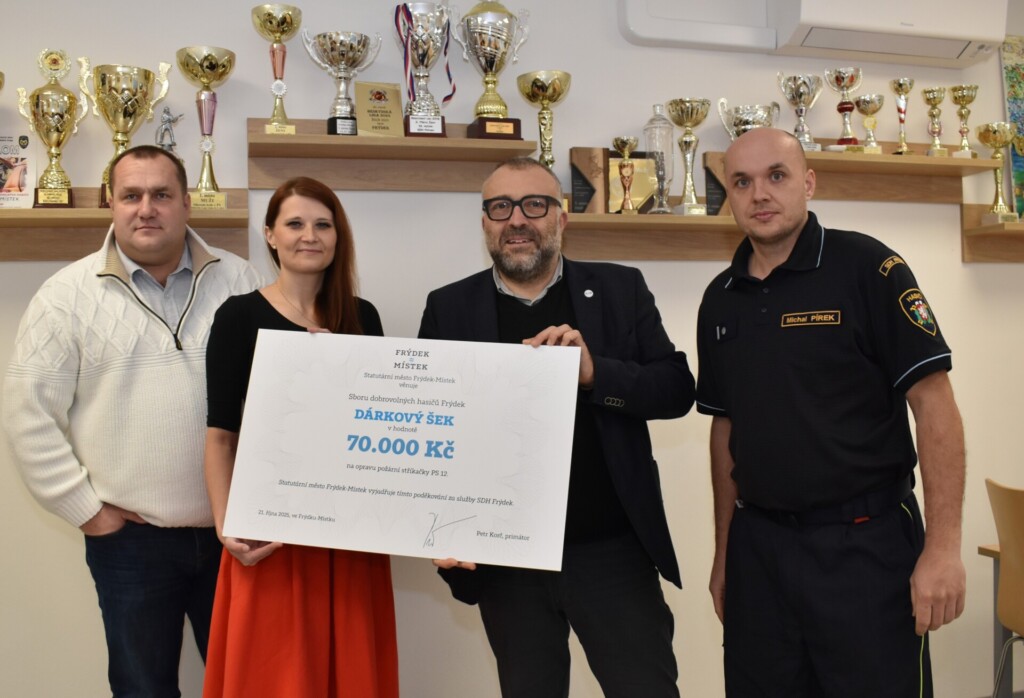 „Proto jsme SDH Frýdek darovali pro mladé hasiče na opravu stříkačky 70 tisíc korun a zbylou finanční částku pokryjí ze svých úspor“ potvrdil náměstek primátora pro oblast bezpečnostních rizik, požární ochranu, prevenci kriminality, městskou policii a ochranu veřejného pořádku Lukáš Kmec (ANO 2011). Zástupcům SDH Frýdek předali symbolický šek primátor Petr Korč (Naše Město F-M) a náměstek Lukáš Kmec.