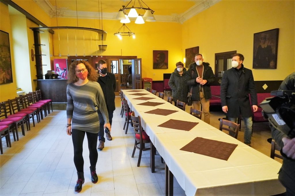 Účastníci prohlídky v podobném složení si i v Národním domě prohlédli všechny využitelné prostory, které se rovněž ukázaly pro potřeby očkovacího centra velmi vyhovující. Dispozice umožňují dostatek prostor pro čekárnu, samotnou vakcinaci i potřebné zázemí. „I tady zdravotníci najdou vše, co potřebují, Národní dům každý zná a je ještě lépe dostupný, protože je v centru a s frekventovanější městskou hromadnou dopravou. Shodli jsme se, že varianta Národního domu teď bude pro nás číslo jedna,“ informoval primátor Michal Pobucký. Náměstek pro kulturu a sport Pavel Machala doplnil: „V Polárce by byl provoz očkovacího centra a aktivit na ledě neslučitelný, tady by kultura v případě potřeby odříznuta úplně nebyla. Většina akcí začíná až v podvečer a řekli jsme si, že by neměl být problém sál po provozní době očkovacího centra rychle připravit, například pro taneční. Ale uvidíme, co všechno bude možné pořádat, i to, jaká bude dostupnost vakcín.“