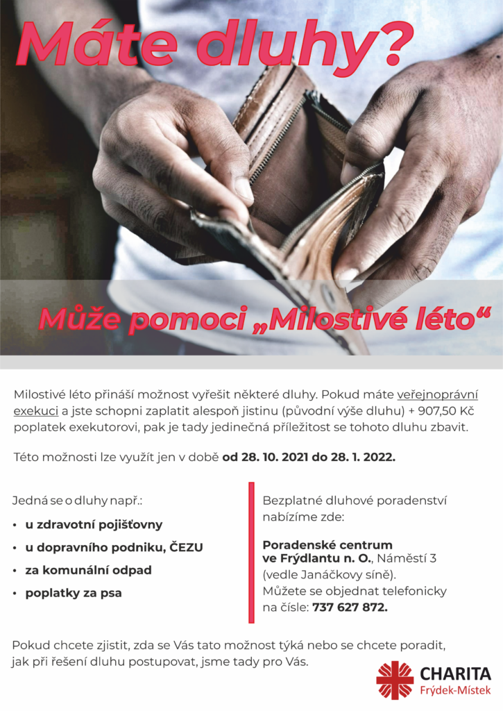 Poradenské centrum: Náměstí 3, 739 11 Frýdlant n. O., email: poradna.frydlant@charitafm.cz, tel.: 737627872, web: www.charitafm.cz