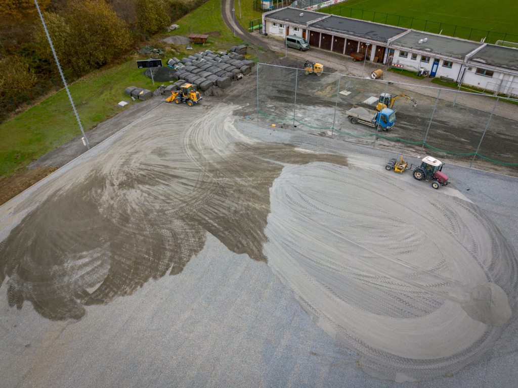 Nejprve bylo nutné odstranit původní umělý povrch, stávající betonové obruby i sportovní vybavení. Nato byly zahájeny zemní práce, které jsou nezbytné kvůli srovnání pláně do roviny. Po srovnání plochy byly osázeny betonové obruby, následuje položení několika dalších vrstev, z toho poslední vrstva mletého lomového kameniva, na níž už přijde umělý trávník výšky se vsypy křemičitého písku a gumového granulátu.