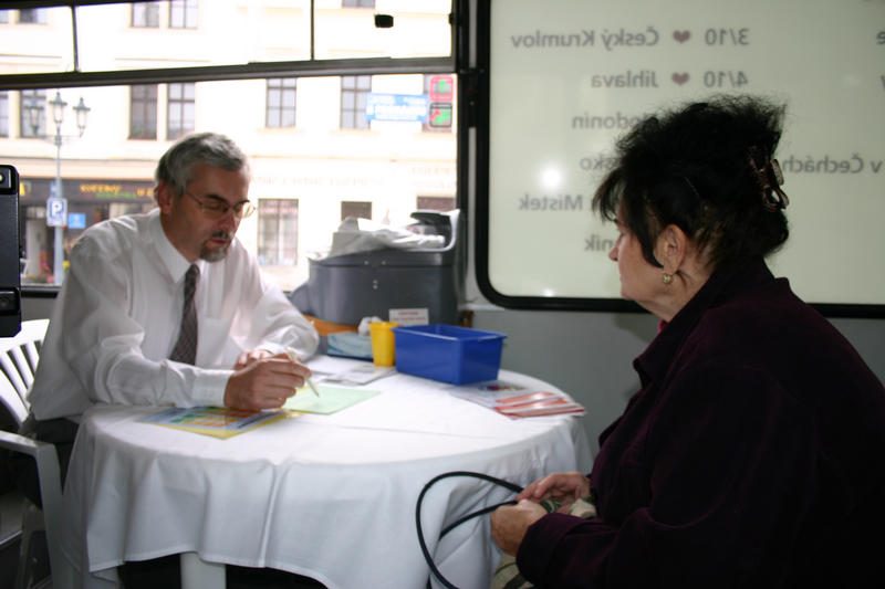 O hodinu později se dveře autobusu otevřely a zdravotničtí pracovníci zájemcům začali provádět měření tlaku krve, vyšetření koncentrace cholesterolu, měření hladiny krevního cukru a stanovení kardiovaskulárního rizika.
