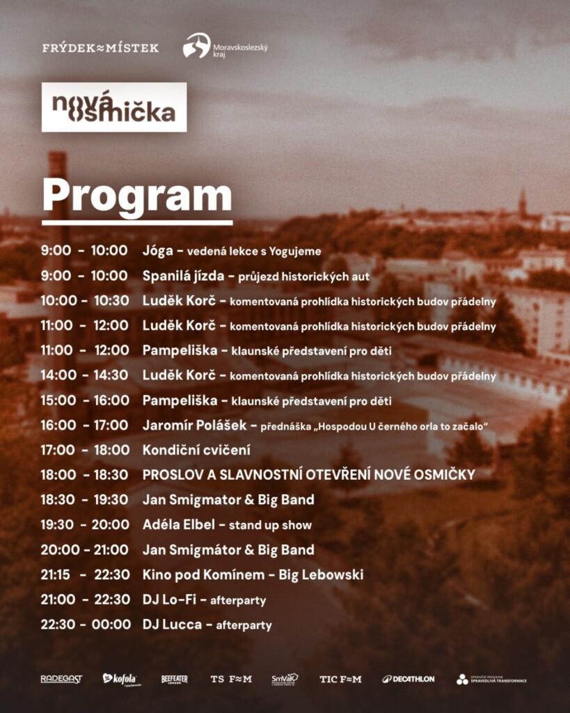 V pátek 1. května se veřejnosti otvírá také nové kulturní a komunitní centrum Nová Osmička v areálu bývalé přádelny. „Tento bývalý textilní areál se začlení do života města. Považuji to za velký úspěch a doklad smysluplnosti Memoranda mezi Frýdkem-Místkem a Slezanem Holding, které před více než 10 lety připravil kolega a současný náměstek primátora Jiří Kajzar. V Nové Osmičce se budou konat komunitní, kulturní a sportovní akce pro všechny generace, od dětí po seniory. Většina těchto akcí bude pro veřejnost zdarma. Avšak areál není jen o akcích, ale i o dobré gastronomii. Jde o jedinečný projekt přesahující město, region i hranice republiky. Děkuji investorovi!“ uvedl primátor Petr Korč (Naše Město F-M).