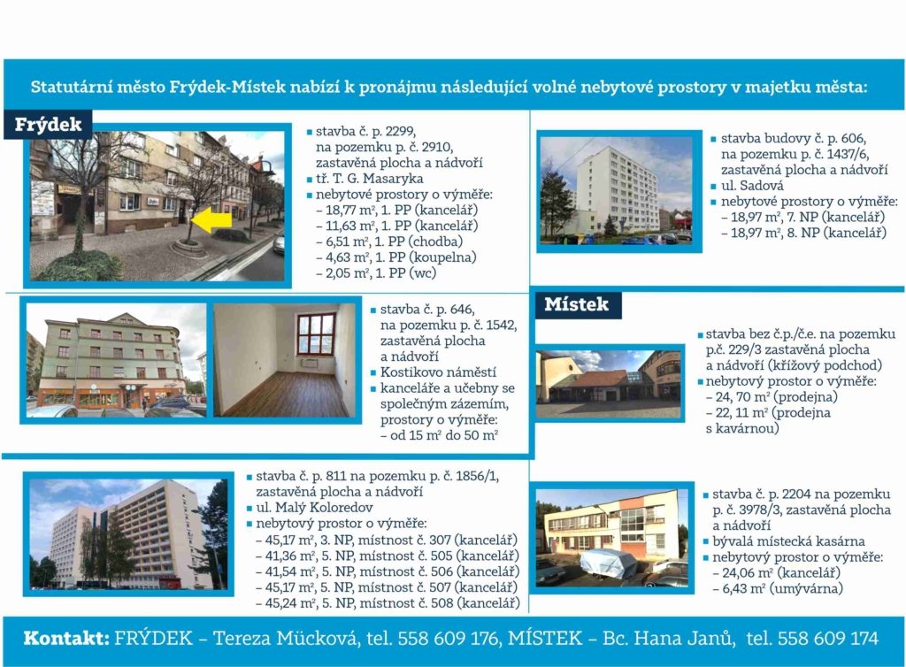 Aktuální nabídka nebytových prostor k pronájmu. Více informací FRÝDEK – Tereza Mücková, muckova.tereza@frydekmistek.cz, tel. 558 609 176, MÍSTEK – Bc. Hana Janů, janu.hana@frydekmistek.cz, tel. 558 609 174