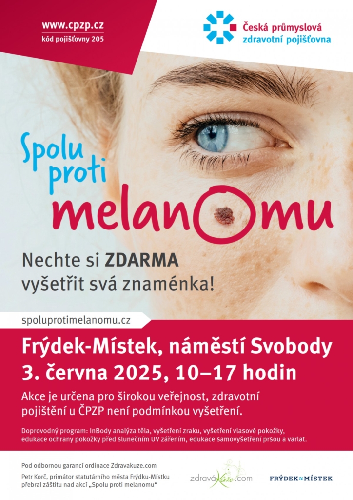 Bezplatné vyšetření mateřských znamének s Českou průmyslovou zdravotní pojišťovnou je pro obyvatele Frýdku-Místku a okolí připraveno i letos, a to v úterý 3. června od 10 do 17 hodin na náměstí Svobody.