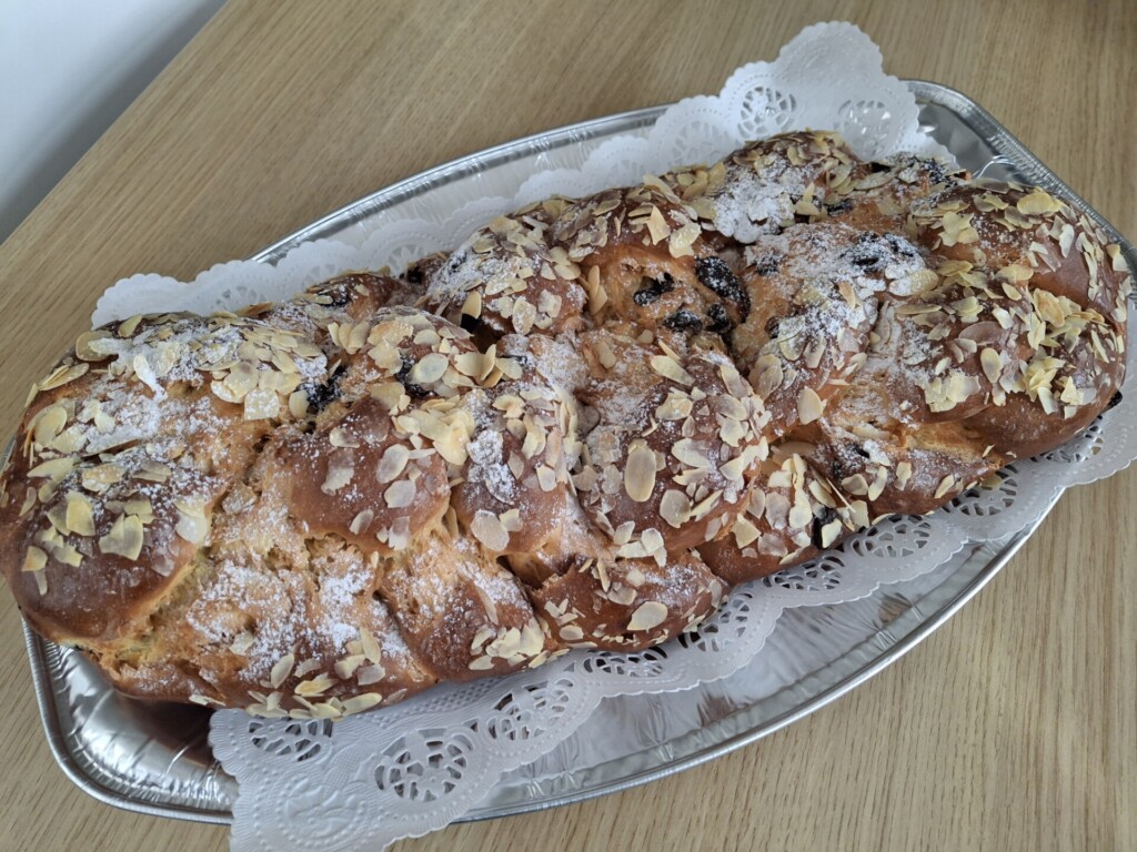 Postup: Do mísy robota si navážíme mouku, sůl, koření a promícháme. V rendlíku si ohřejeme mléko a cukr, který v mléce necháme rozpustit, pak do něj rozdrobíme droždí a nalijeme do důlku v mouce, necháme vzejít asi 10 minut a dáme zpracovat do robota, až je těsto zpracované, teprve přidáme rozpuštěné máslo a nakonec vmícháme rozinky, ještě asi 15–20 minut hněteme. Necháme asi hodinu vykynout, až zdvojnásobí svůj objem. Vykynuté těsto vyklopíme na vál a trochu propracujeme, rozdělíme na dvanáct stejných dílů, ze kterých upleteme dvě vánočky. Necháme je ještě asi půl hodiny kynout na plechu přikrytém utěrkou, pak potřeme rozšlehaným vejcem a sypeme plátky mandlí. Pečeme na horkovzduch zpočátku na 180 stupňů, asi po 10 minutách stáhneme teplotu na 160 stupňů a ještě asi 35 minut dopékáme.