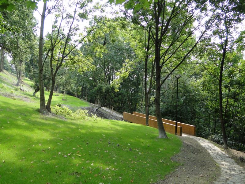 Vyčištěný prostor od náletových dřevin a buřeně nyní zaplňují solitérní stromy, které nebrání průhledu na dominantu zámku. Na méně strmých místech byly založeny trávníkové plochy se zachováním původního bylinného patra a na zbylých těžko přístupných svazích byly vysazeny půdopokryvné dřeviny, jako je břečťan a loubinec, které by měly postupně prolnout s konstrukcemi drátokošů gabionových zdí. Východní část svahů zdobí neplodící třešně, které částečně navozují atmosféru zaniklých městských sadů. Při hlavním promenádním chodníku byly založeny trvalkové záhony.