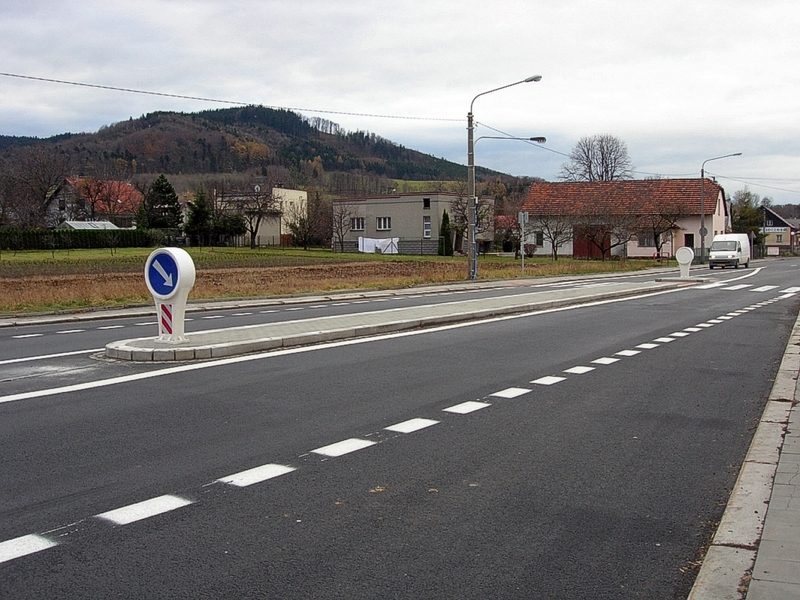 Ostrůvek o délce téměř třicet metrů je široký dva metry. Dopravní značky umístěné na obou jeho čelech jsou pro zdůraznění ostrůvku prosvětlené a v obrubnících jsou instalována sklěněná reflexní oka. Samotný přechod pro chodce je v souladu s moderními trendy nasvětlen samostatnými svítidly.