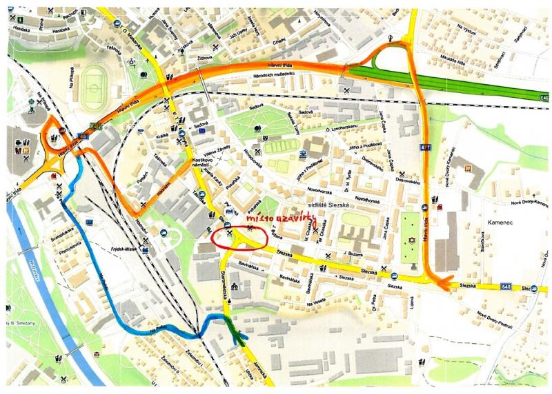 Objízdné trasy – vedeny po ulici Na Poříčí, Nádražní a Hlavní třída – viz příloha.