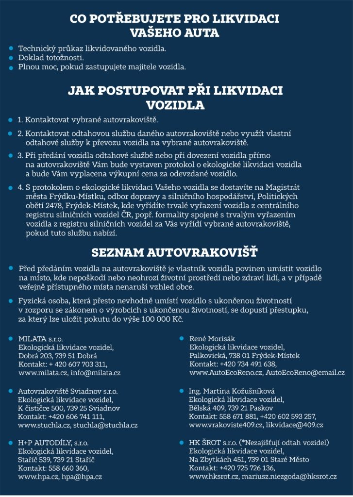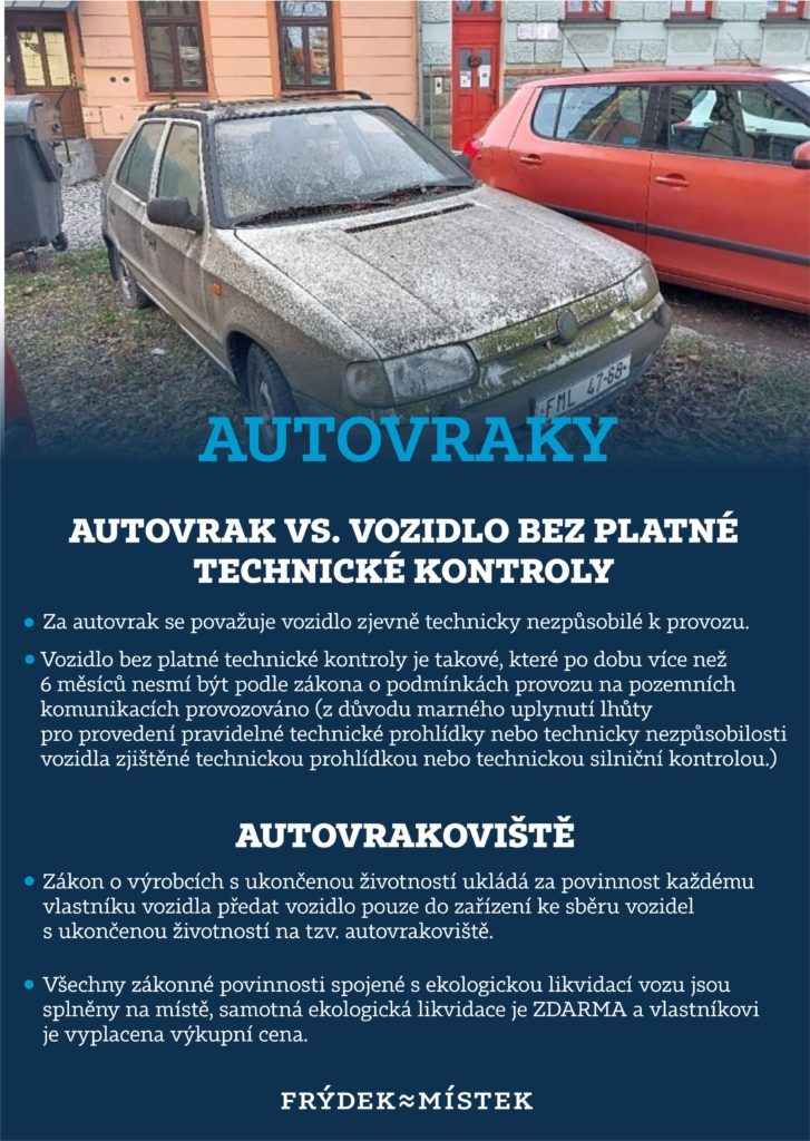 Frýdek-Místek čistí ulice od autovraků. V letošním roce se radnici podařilo do začátku června vyřešit 15 případů „automobilových pomníčků“ na území města. Nyní město dává vlastníkům další podrobný návod, jak mohou nepojízdný vůz zákonně zlikvidovat sami. Chce tak předejít zdlouhavým administrativním procesům.