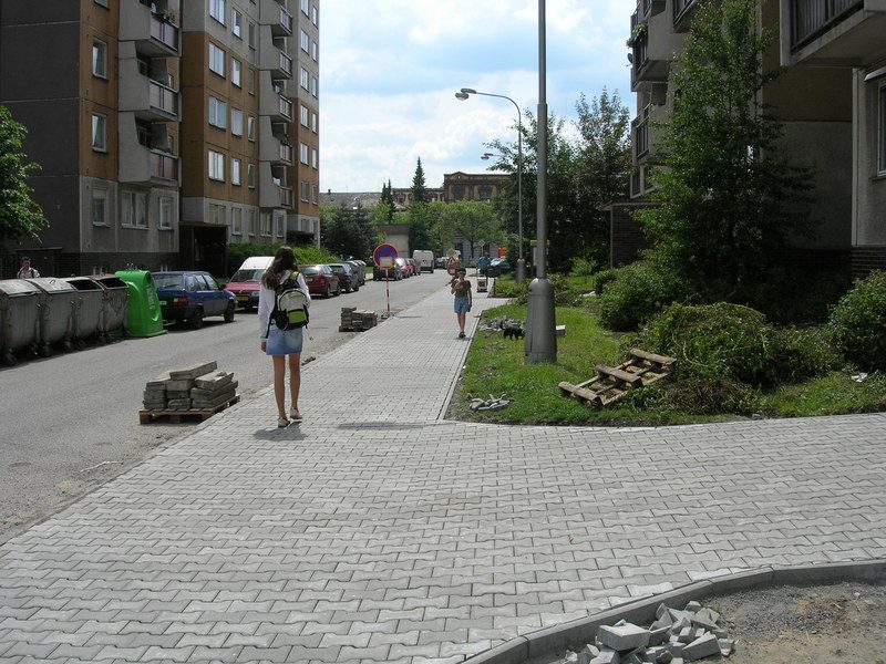 Stará dlažba 30 x 30 cm byla nahrazena novou, zámkovou. Vyměněny byly i chodníkové obrubníky.