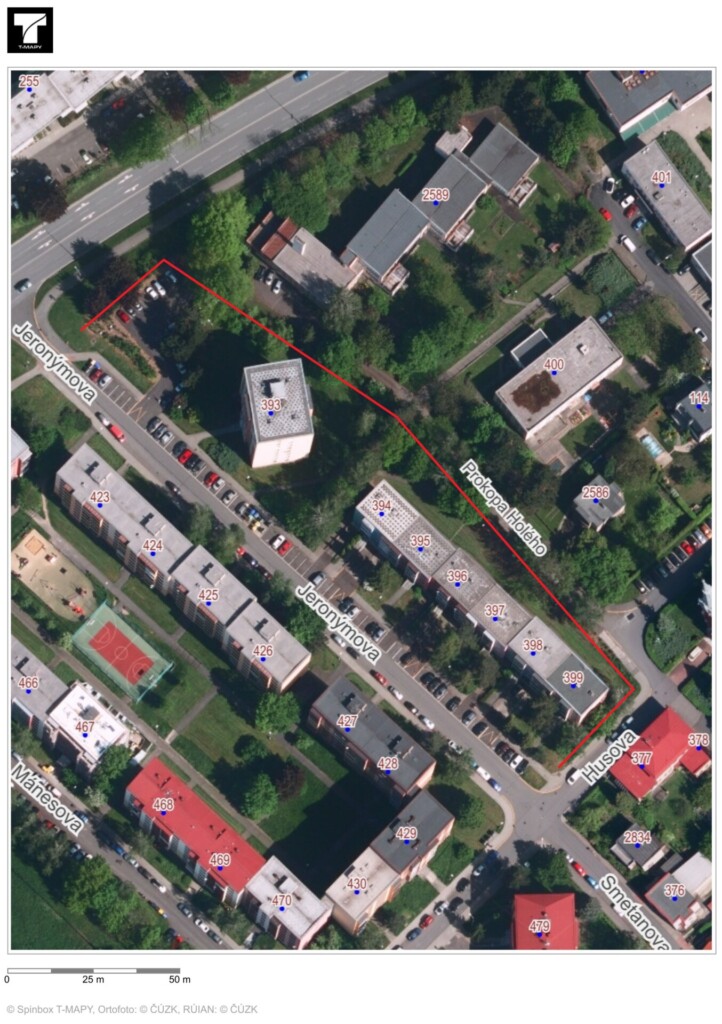 Druhá část rekonstruovaného teplovodu vede od ulice Jeronýmova č.p. 393, kolem parkoviště, podél ulice Prokopa Holého k domu č.p. 399 v Husově ulici. Bude vykácena 74 stromů a cca 800 m2 okrasných keřů.