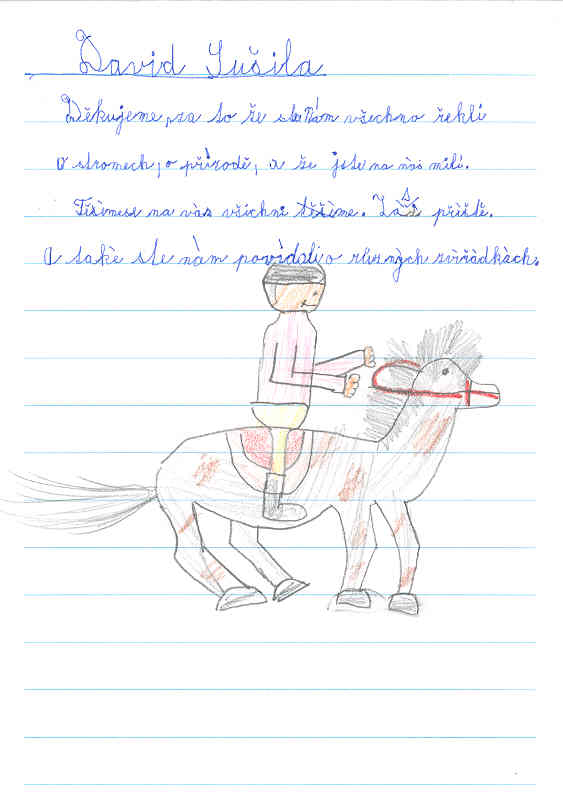 Rádi bychom poděkovali panu Gavlasovi, paní Vajdové a paní Mlejnkové za dvě krásná úterý, které jsme mohli strávit na Hatích. Poznávali jsme kůry stromů, brouky, škůdce, bažinu, rostliny. Moc se nám líbilo v lesní tělocvičně a na horolezecké stěně. S velkým zaujetím jsme sledovali, jak snadno lze ze starého papíru vyrobit papír nový. Tato technika se nám natolik zalíbila, že jsme si ji všichni vyzkoušeli. Vašim programem jsme byli tak nadšeni, že jsme vůbec neváhali nad tím, zda se máme zúčastnit také Dne Země, kde jsme měli možnost si zasoutěžit v mnoha zajímavých disciplínách.