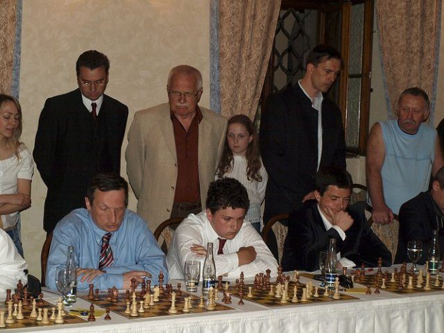 Nejlepší šachista světa GM Vladimir Kramnik po tříhodinném souboji 16 partii vyhrál a čtyři partie zremizoval. A jak hrál náš reprezentant Tomáš Bujnošek?– snažil se, bojoval, ale prohrál. Přeci jenom mistr světa je mistr světa. Tomáš musel bojovat nejen s nejlepším šachistou světa, ale i s mírnou nervozitou. Posuďte sami, zprava hrál prezidentův syn Václav Klaus a nad Tomášem vše po dobu tří hodin sledoval sám pan prezident ČR Václav Klaus. To se opravdu hraje velmi těžko. Copak asi říkal pan prezident na výkon Tomáše ?!