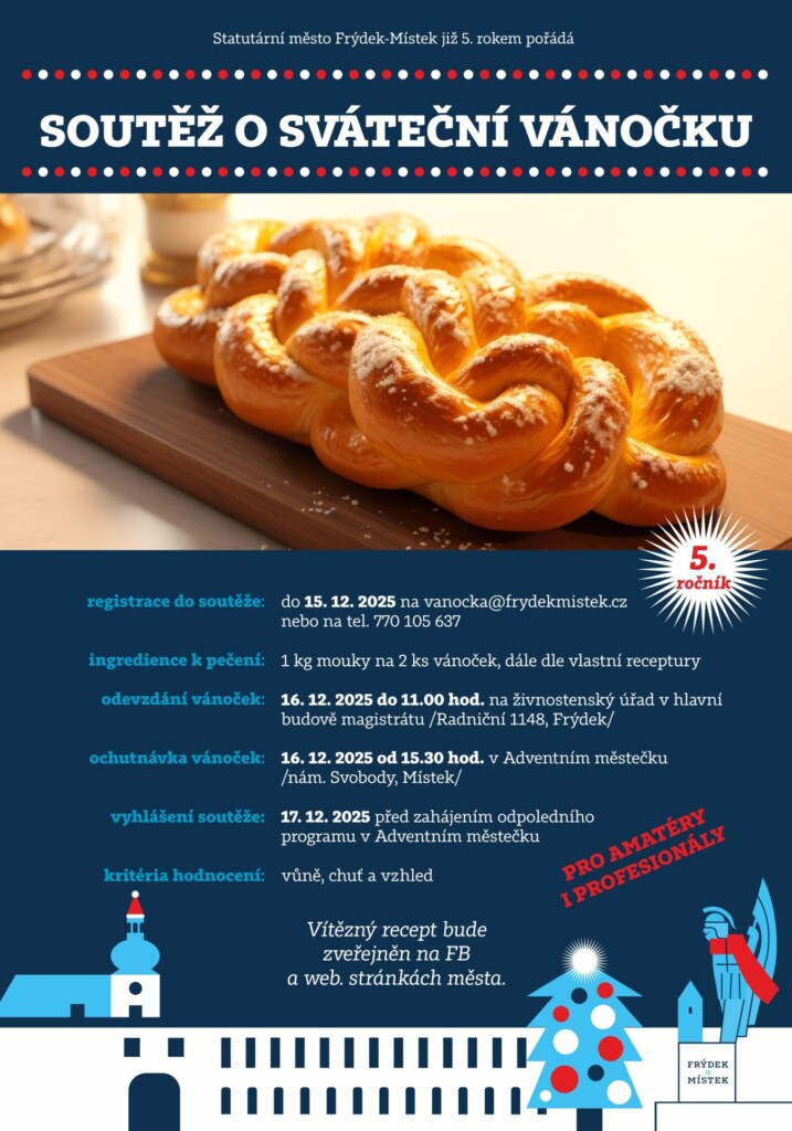 „Soutěžit může doslova každý – nejen amatérští, ale i profesionální kuchaři a pekaři. Stačí se do pondělí 15. prosince 2025 zaregistrovat prostřednictvím e-mailu vanocka@frydekmistek.cz nebo na telefonním čísle 770 105 637. Podmínkou je odevzdání dvou vánoček upečených dohromady z jednoho kilogramu mouky a poskytnutí receptu,“ připomněl pravidla náměstek primátora pro životní prostředí a zemědělství, územní plánování a rozvoj, stavebně správní činnosti, ekonomický rozvoj a podnikání a dotace a integrované teritoriální investice Lukáš Slíva (SPOLU).