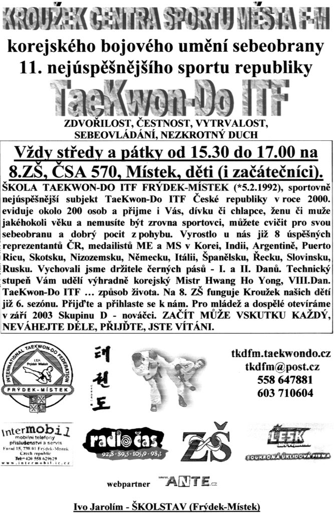 Již každoročně poskytuje Škola korejského bojového umění TaeKwon-Do ITF FRÝDEK-MÍSTEK šanci začít se věnovat sebeobraně, a dětem a mládeži nabízí sportovní aktivitu. O široké nabídce tohoto v roce 2000 sportovně nejúspěšnějšího klubu TaeKwon-Do ITF v České republice se můžete dočíst na stránkách