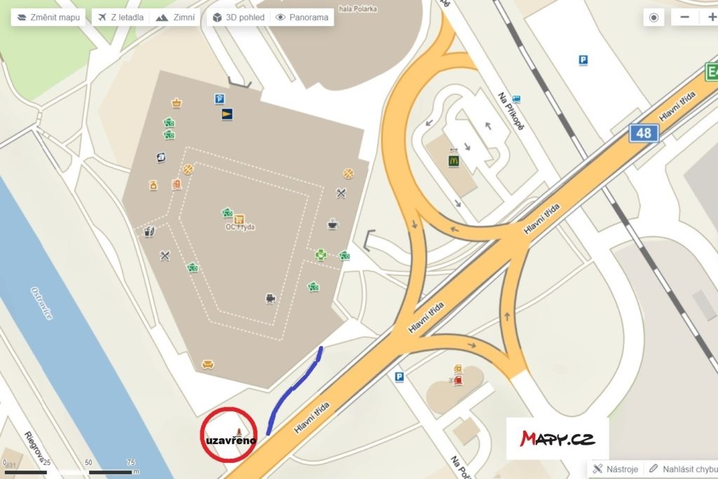 Pěší jsou minimálně omezeni, pro vstup na ulici Hlavní mohou využít přilehlý chodník od OC Frýda – viz mapa.