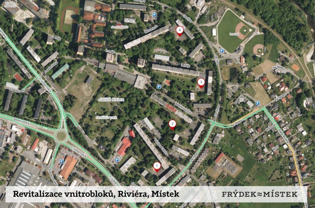 „Do těchto vnitrobloků umístíme nové dětské herní prvky, mobiliář, jako jsou lavičky, odpadkové koše, také položíme nové chodníky a vysadíme zeleň. Chátrající asfaltová plocha mezi ulicemi V. Talicha a Beethovenova by mohla sloužit jako parkoviště. Projekt na revitalizaci sídliště Riviéra byl zastaven předchozím vedením, pro nás je ale důležité jej znovu rozjet,“ upřesnil náměstek primátora pro investice, finance, rozpočet, majetkoprávní vztahy města a útvar hlavního architekta Jiří Kajzar (Naše Město F-M).