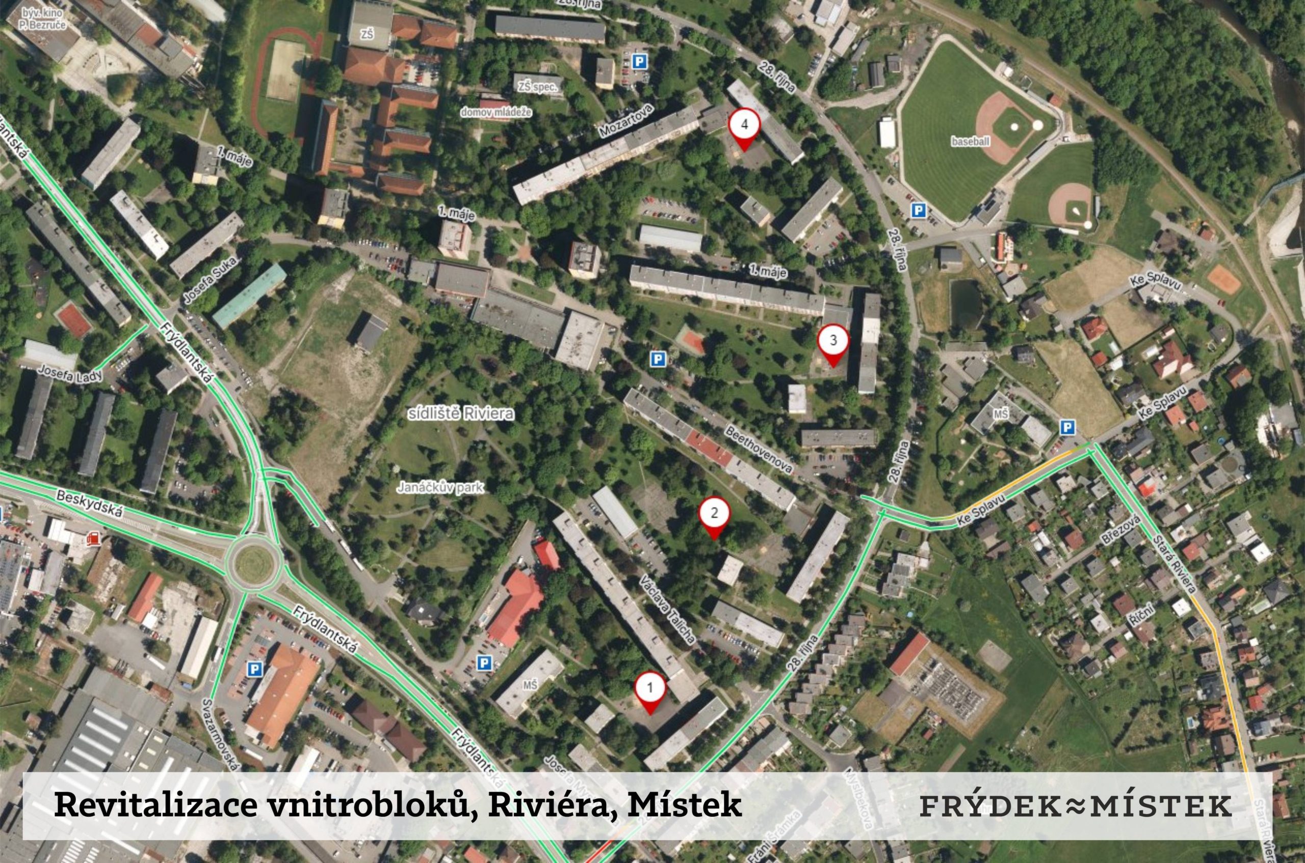 „Do těchto vnitrobloků umístíme nové dětské herní prvky, mobiliář, jako jsou lavičky, odpadkové koše, také položíme nové chodníky a vysadíme zeleň. Chátrající asfaltová plocha mezi ulicemi V. Talicha a Beethovenova by mohla sloužit jako parkoviště. Projekt na revitalizaci sídliště Riviéra byl zastaven předchozím vedením, pro nás je ale důležité jej znovu rozjet,“ upřesnil náměstek primátora pro investice, finance, rozpočet, majetkoprávní vztahy města a útvar hlavního architekta Jiří Kajzar (Naše Město F-M).