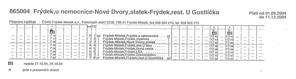 Autobus bude jezdit zkušebně v období od 1. 9. do 31. 12. 2004 ve třech spojích denně. Trasa povede od autobusové zastávky Frýdek-nemocnice přes myslivnu, Nové Dvory-statek, restauraci u Lesa, Černou cestu, LIDL, ul. Dobrovského až k zastávce Frýdek-restaurace u Gustlíčka. „Věc jsme konzultovali jak s dopravním inspektorátem policie a dopravcem, tak i s odborem školství, kultury, mládeže a tělovýchovy a nezapomněli jsme ani na rodiče žáků. Snažili jsme se splnit svůj slib, zajistit pro školáky ze zrušené základní školy bezpečnou dopravu a to se nám, myslím, daným rozhodnutím povedlo,“ vyjádřil se k věci radní Mgr. Petr Cvik.