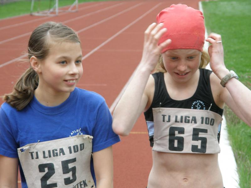 FOTO 2 – na startu mladší žákyně Kateřina Krtková a Helena Benčová /se šátkem/. Helena jasně zvítězila ve výborném čase na 600 metrů 1:50.0 minuty.