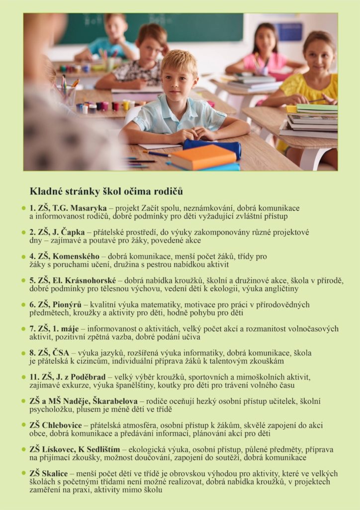 Z dotazníků vyplývá, že na žádné škole není závažný problém, na který by rodiče hromadně upozorňovali. Navrhovali jednotlivosti týkající se výuky, kroužků, školních pomůcek, kterými se vedení škol a město bude postupně zabývat. Zároveň hodnotili celkové klima na školách.